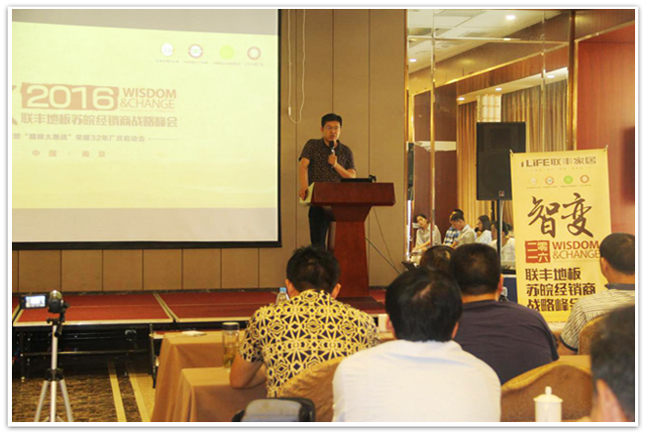 2016年6月16日-17日,“智·變2016”聯(lián)豐地板蘇皖經(jīng)銷商戰(zhàn)略峰會(huì)在六朝古都南京成功舉行,蘇州聯(lián)豐木業(yè)有限公司總經(jīng)理李玉明、財(cái)務(wù)總監(jiān)溫新妹、市場(chǎng)部部長(zhǎng)路世培、終端部部長(zhǎng)闕曉晶、營(yíng)銷中心骨干以及來自于蘇皖地區(qū)的核心經(jīng)銷商參加了本次峰會(huì)。