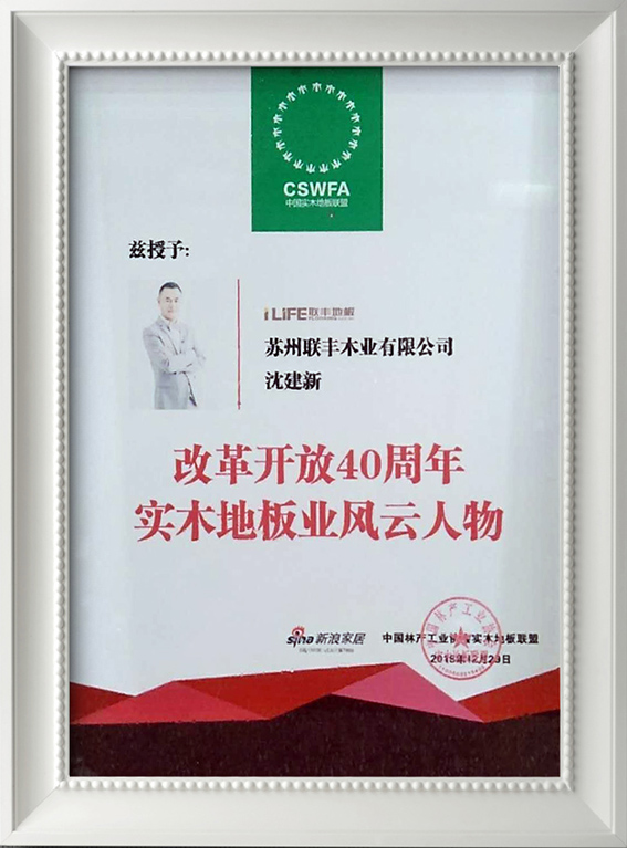 2018年,我國(guó)迎來(lái)了改革開(kāi)放四十周年,這是家國(guó)巨變的40年,在這四十年中,地板行業(yè)從無(wú)到有,到強(qiáng),到精,獲得了全面的飛速發(fā)展,悄然形成了屬于地板人的黃金時(shí)代!12月29日,由中國(guó)林產(chǎn)工業(yè)協(xié)會(huì)實(shí)木地板聯(lián)盟舉辦的“改革開(kāi)放四十周年實(shí)木地板業(yè)表彰大會(huì)”于浙江南潯隆重開(kāi)幕,聯(lián)豐木業(yè)董事長(zhǎng)沈建新先生應(yīng)邀出席大會(huì),并榮耀當(dāng)選“改革開(kāi)放40年實(shí)木地板業(yè)風(fēng)云人物”!