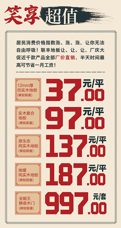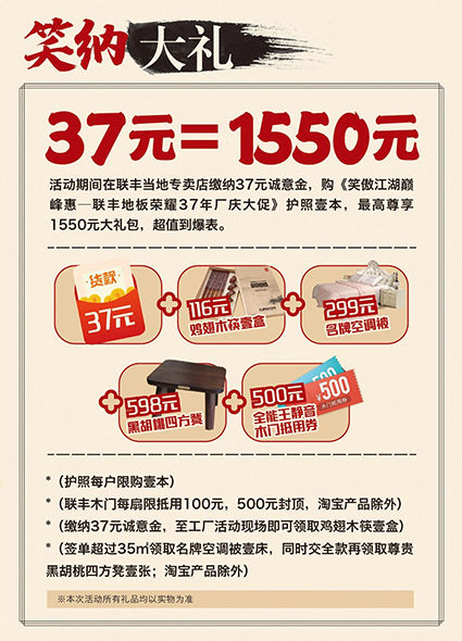 喜歡他,就趕快報(bào)名,親臨聯(lián)豐與偶像零距離,現(xiàn)場更為您的愛家準(zhǔn)備了數(shù)百款品優(yōu)價(jià)廉的地板和木門產(chǎn)品,砸金蛋、抽大獎(jiǎng)等環(huán)節(jié)將誕生百萬豪禮,就等你來搶!