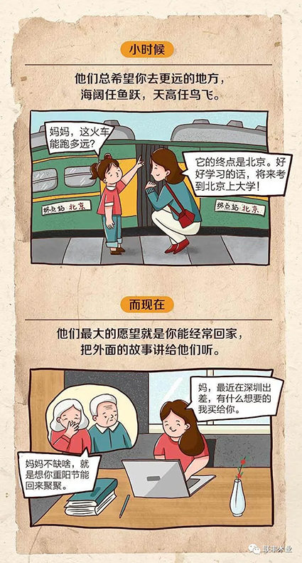 臺(tái)灣作家龍應(yīng)臺(tái)說“所謂父母子女一場(chǎng),只不過是意味著,你和他的緣分就是今生今世不斷地在目送他的背影漸行漸遠(yuǎn)。你站在小路的這一端,看著他逐漸消失在小路轉(zhuǎn)彎的地方,而且,他用背影默默地告訴你,不用追?!币苍S父母和孩子,真的不能時(shí)時(shí)刻刻的陪伴,當(dāng)我們因?yàn)楣ぷ?,又或因?yàn)槌杉?、養(yǎng)育子女種種原因,無法抽空看望家里的老人時(shí),不妨給予他們更多更真切的關(guān)懷。