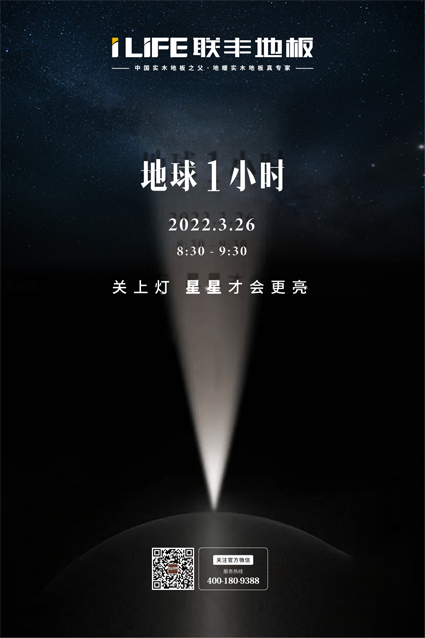 聯(lián)豐地板與全世界共同踐行“相約2030:萬象更新,回歸自然”的十年環(huán)保承諾,助力“地球一小時”,全國1000間門店將同時關(guān)閉非必要光源,以熄燈的行動踐行環(huán)保理念。