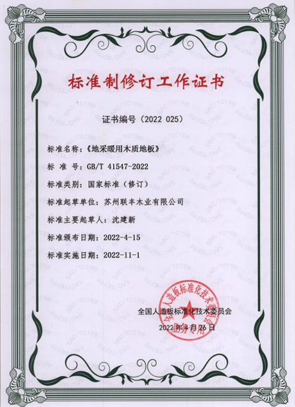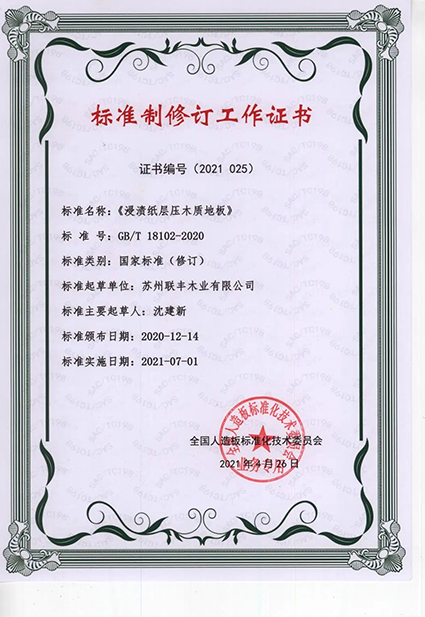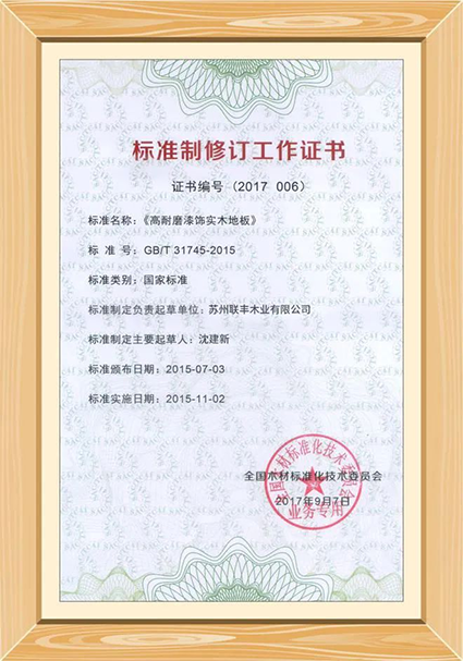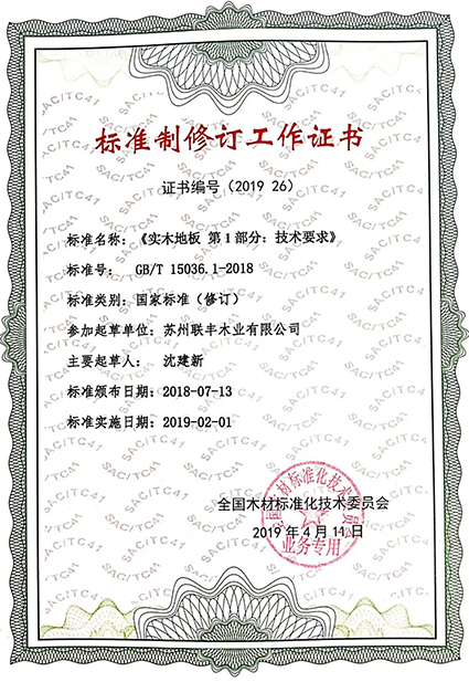 聯(lián)豐地板坐落于中國實木地板產(chǎn)業(yè)基地,對實木及實木復合地板地板的生產(chǎn)技術、加工及檢驗標準更有心得。作為中國實木地板之父,聯(lián)豐地板當仁不讓地成為GB/T 15036.1-2018《實木地板》的重要起草單位;敢于創(chuàng)新的聯(lián)豐地板,積極探索實木復合地板的更多可能,受邀成為了GB/T 18103-2013《實木復合地板》、GB/T 18102-2020《浸漬紙層壓木質地板》國家標準的起草單位。