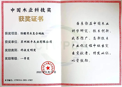 聯(lián)豐除醛實(shí)木復(fù)合地板獲“中國(guó)木業(yè)科技發(fā)明一等獎(jiǎng)”