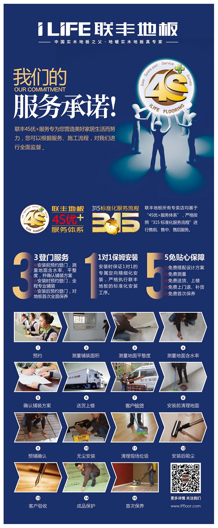 2010年,聯(lián)豐就推出了專屬的4S優(yōu)+服務(wù)體系,從地板銷售(Sale),到輔料配件(Spare part),售前售后服務(wù)(Service),再到信息反饋(Survey),每一個(gè)流程都做到規(guī)范化運(yùn)作,并要求全國(guó)千家門店都要嚴(yán)格按照“315標(biāo)準(zhǔn)化服務(wù)流程”進(jìn)行售前、售中、售后服務(wù)。