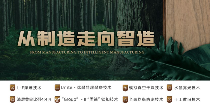 獨(dú)創(chuàng)“漆層黃金比列4:4:4”、“Unite-優(yōu)耐特超耐磨技術(shù)”、“全面均衡防潮技術(shù)”、“模擬真空干燥技術(shù)”和“Group”_II“固鋪”鎖扣技術(shù);