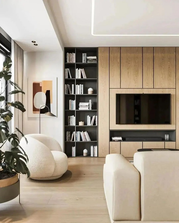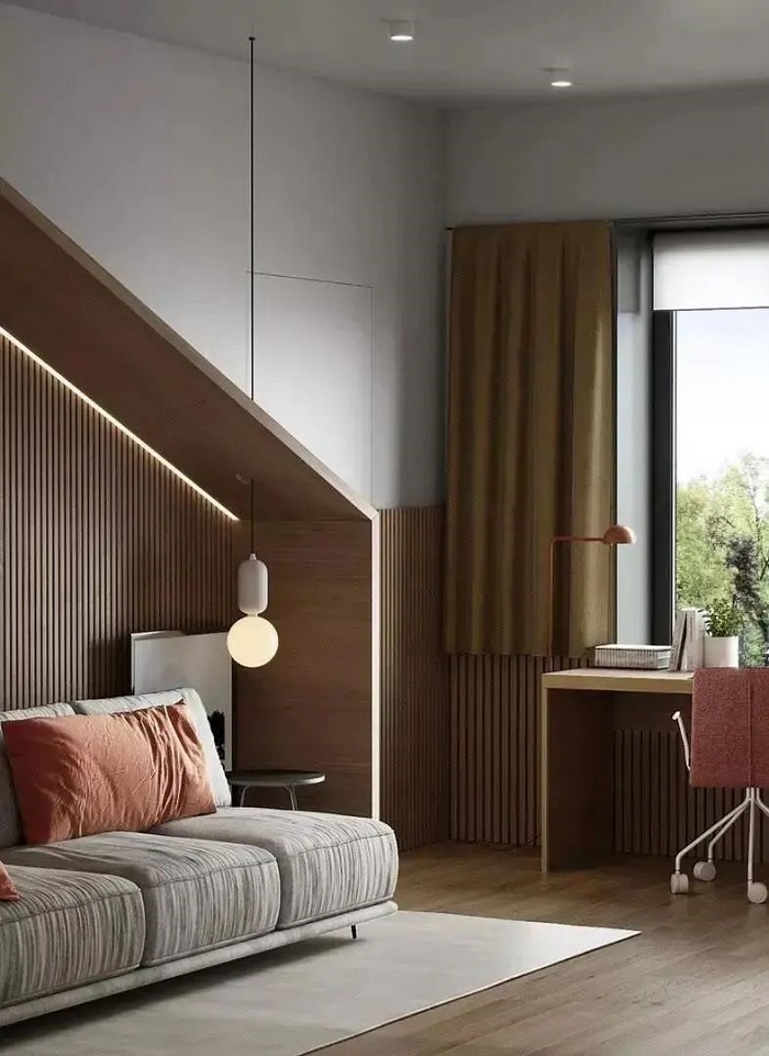 簡(jiǎn)約灰白與原木色聯(lián)豐與之呼應(yīng)呈現(xiàn)出高級(jí)感,線條感貫穿在墻壁、書架之間的設(shè)計(jì),搭配著春日生機(jī)昂揚(yáng)的綠植,形成另一番愜意之感。