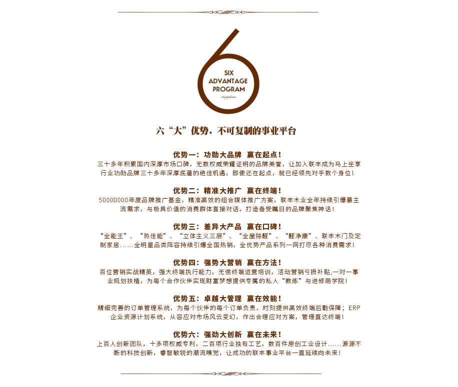 聯(lián)豐公司負(fù)責(zé)全國性的廣告宣傳,包括電視、報紙、雜志、路牌、燈箱、公益贊助等、同時經(jīng)公司總部批準(zhǔn)投入的區(qū)域性廣告,公司可承擔(dān)部分費用。